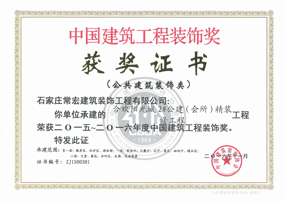 2016年12月23日,2015-2016年度中國(guó)建筑工程裝飾獎(jiǎng)?lì)C獎(jiǎng)大會(huì)在北京國(guó)家會(huì)議中心召開。會(huì)上,由常宏建筑裝飾工程有限公司承建的合歡陽(yáng)光城2#公建(會(huì)所)精裝修工程、金地大廈B座內(nèi)裝修工程一標(biāo)段兩項(xiàng)工程,榮獲2015-2016年度中國(guó)建筑工程裝飾獎(jiǎng)——公共建筑裝飾類。常宏店裝大區(qū)管理中心總經(jīng)理周增良、品管部安全副總監(jiān)孫文海參加了此次頒獎(jiǎng)大會(huì)。